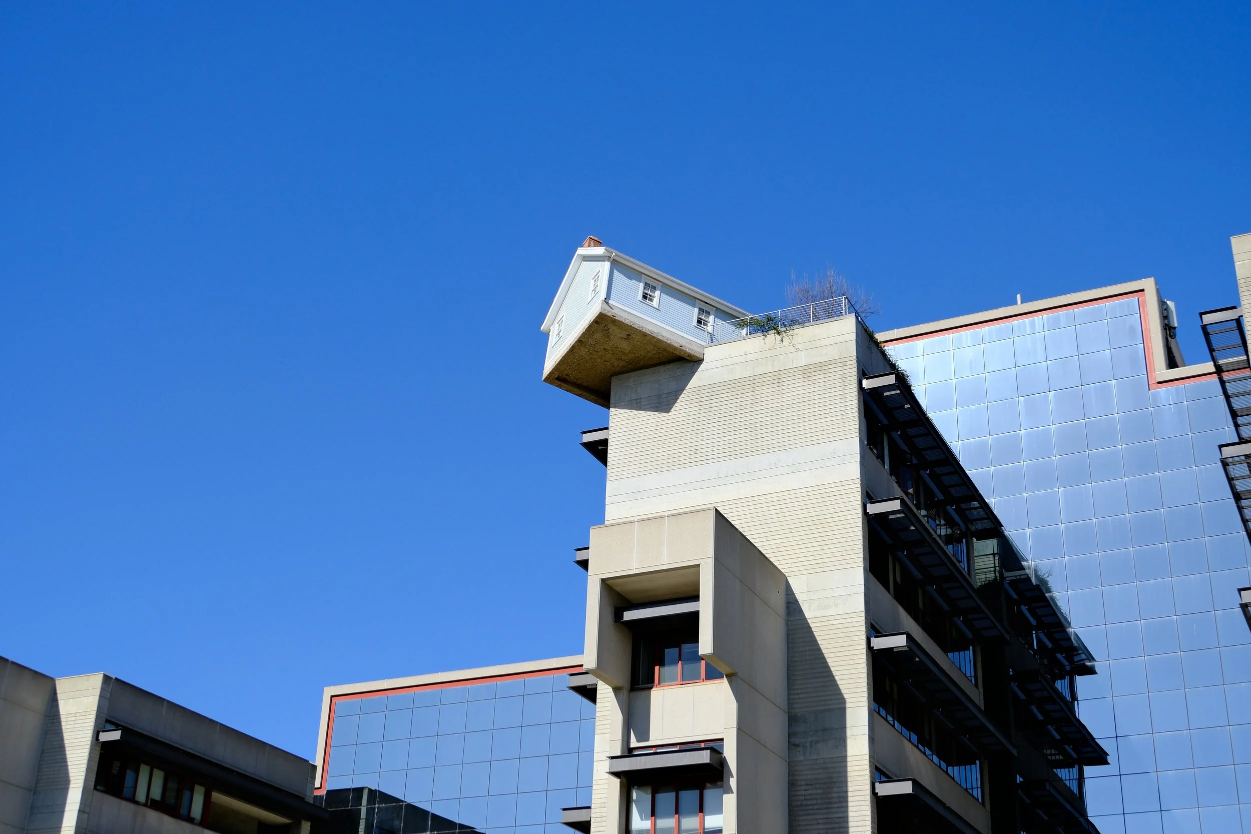 En el techo de un edificio del campus de la universidad UCSD en San Diego, hay una casa que parece haber aterrizado ahí por accidente. O por capricho. Se tambalea en la orilla de Jacobs Hall, como si alguien la hubiera dejado caer desde el cielo y se hubiera quedado atrapada entre dos mundos: el de la arquitectura formal y el de la imaginación desbordada.